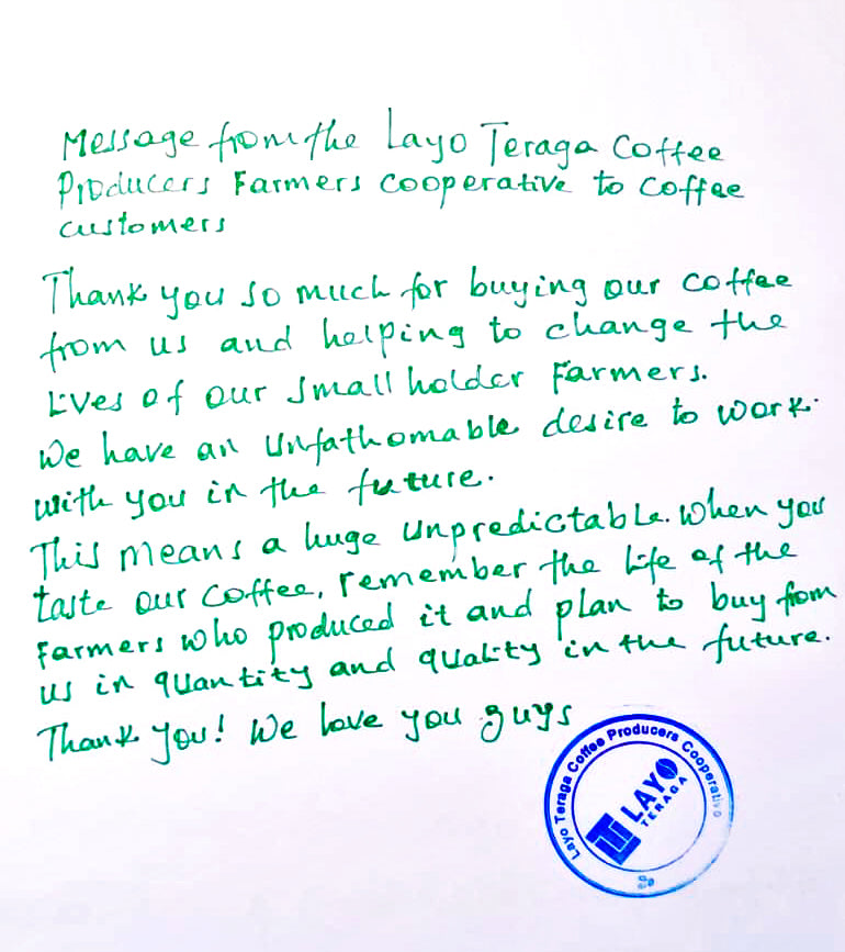 "I made a short documentary about my sourcing work for Crop to Cup in Ethiopia during the 2024-2025 season including a chapter on Layo Teraga. There, you can get a look at the processing station and more background about the cooperative."