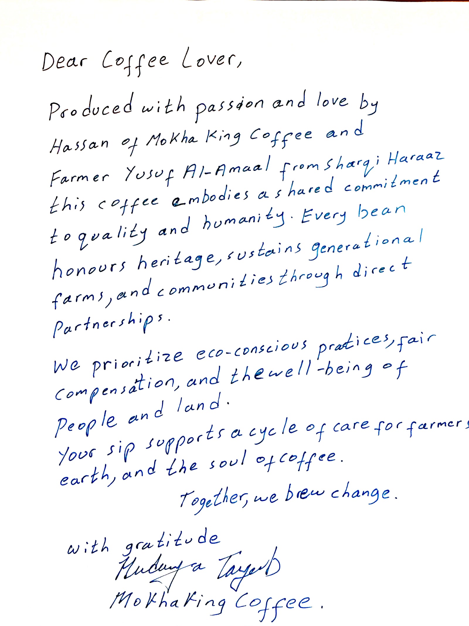 "To produce the lot for Aviary, Hudaifa and Hassan partnered with a fourth-generation coffee producer, Yusuf Al-Aalam. Hassan met Yusuf in 2015 after learning the history of Yusuf's family farm, which dates back to the beginning of Yemeni coffee cultivation more than 500 years ago. Born in Sharqi Haraz, Yusuf moved to Sanaa in pursuit of work after graduating high school in Manakha. The economic challenges posed by the war brought him back to Sharqi Haraz, where he planted and produced coffee on his family's farm, and, in 2019 sold his first crop to Mokha King.